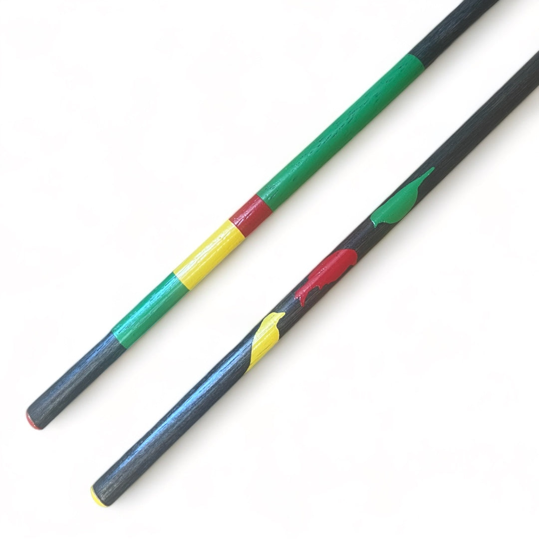 The "3 Little Birdies" is a non-custom golf alignment stick with Green | Yellow | Red stripes outlined with 3 Birds and upholstery tacks that are also Green | Yellow | Red. These sticks are stained Black.
