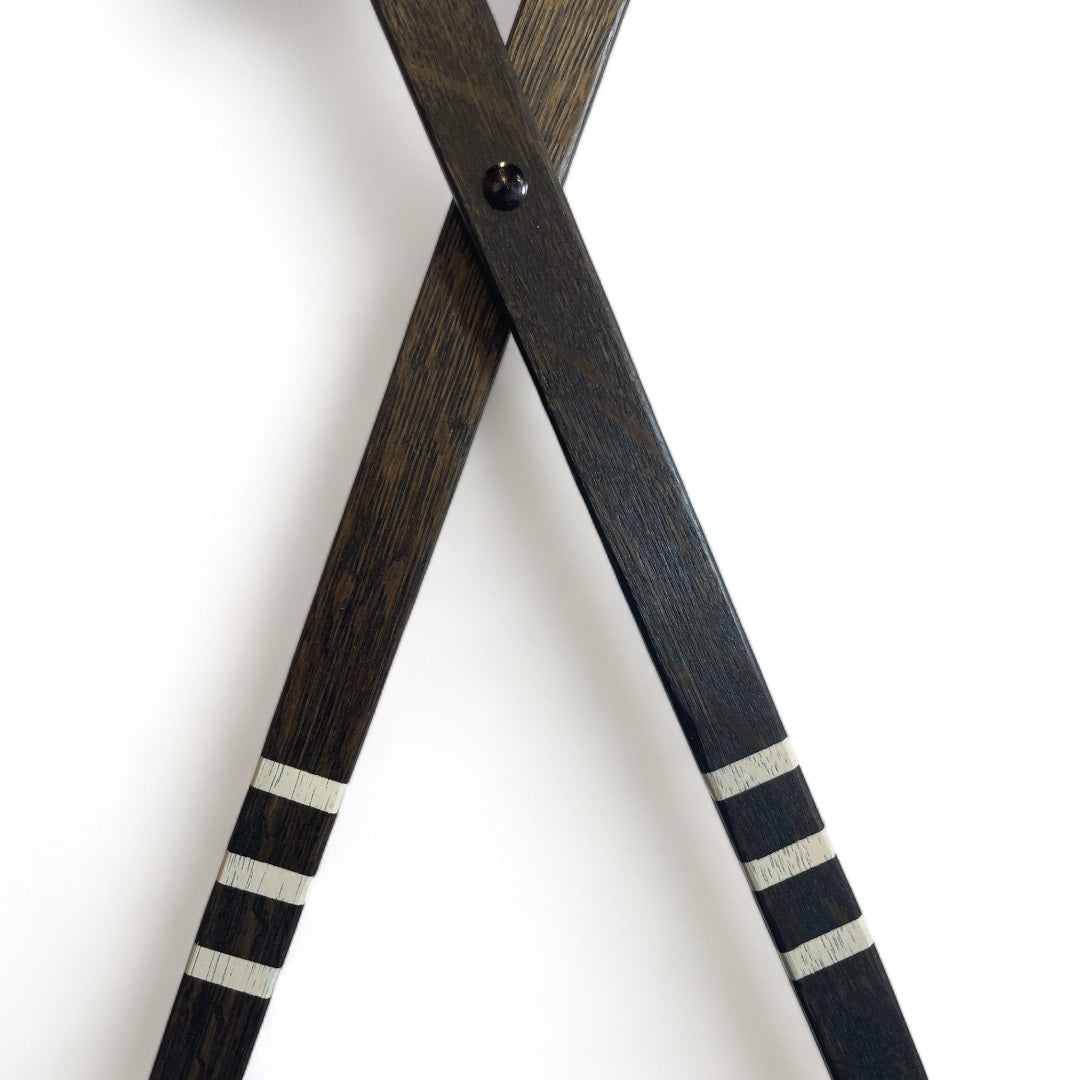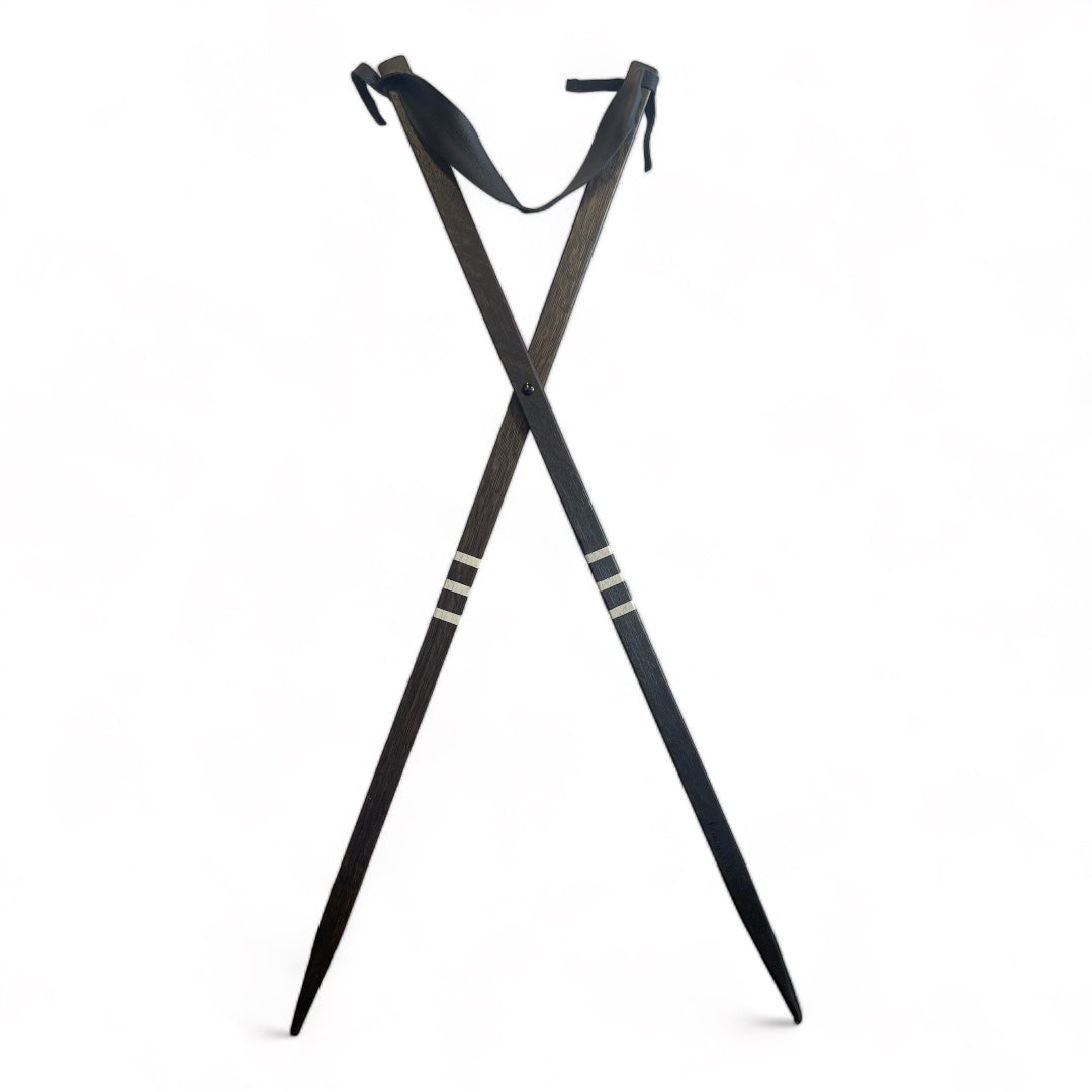 The Trestle Slings or Trestle Sticks are a non-custom golf bag stand with White bands. These are stained black.
