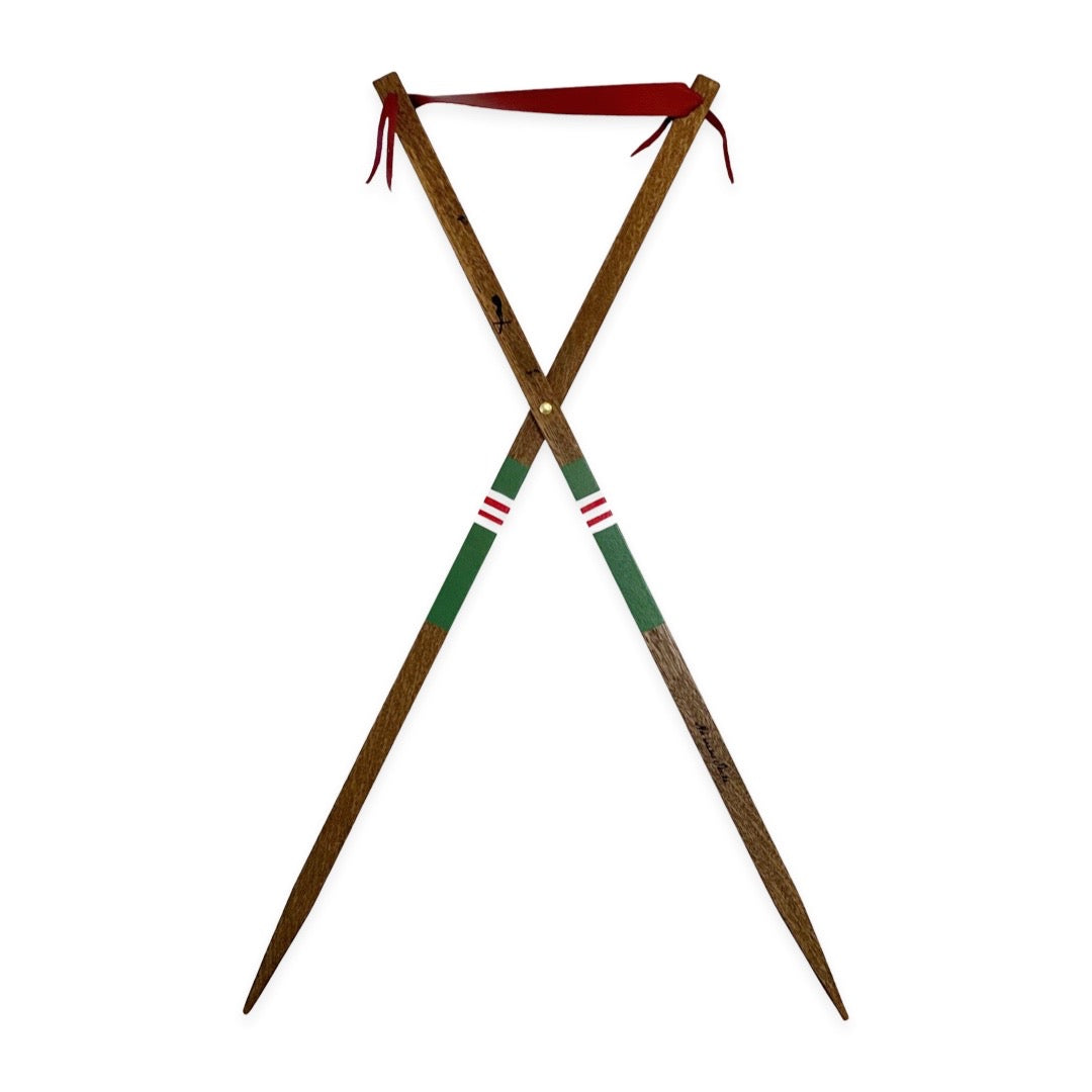 The Trestle Slings or Trestle Sticks are a non-custom golf bag stand with Green | White | Red bands.
